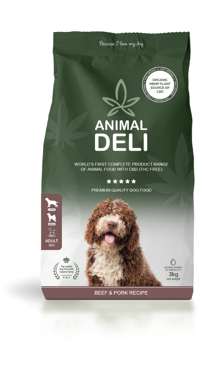 Dried meat 33% (of which beef 50% and pork 50%), cereals, plant by-products, corn meal, rice, animal fat, hemp leaf*, cold-pressed hemp seed oil, fish oil, pumpkin, carrot, chamomile, hemp protein, young wheatgrass, chokeberry, tomato, omega 3, 6 and 9. Ingredients from certified organic farming are marked with *. Proteins 24%, fats 14%.